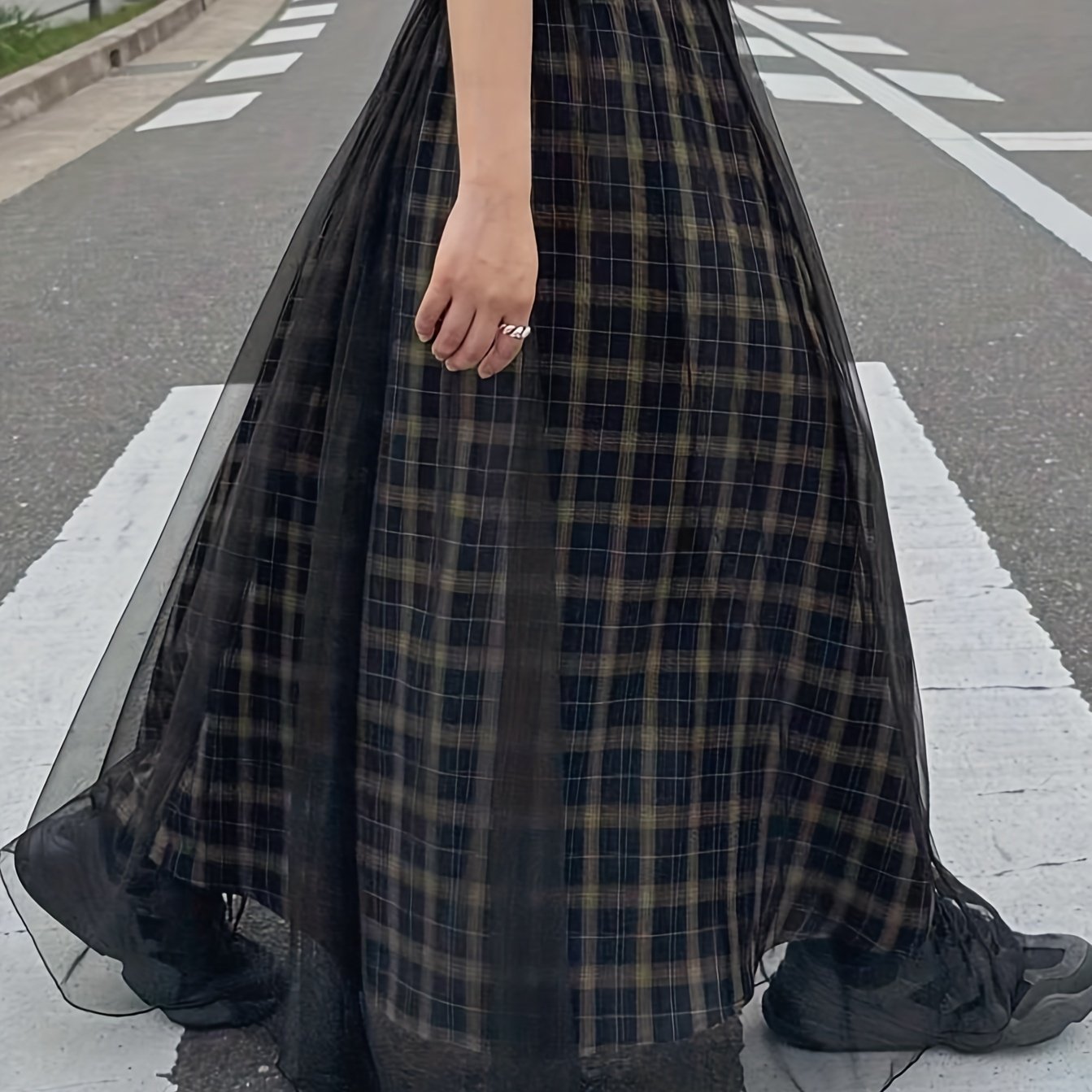 TEMU 봄/여름 여성용 우아한 빈티지 체크 스커트, 플로우 A라인 미디 드레스 (메쉬 패널 & 탄력성 허리)