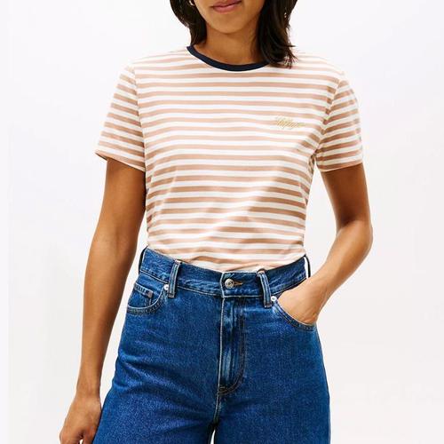 [해외배송] 타미 여성 스크립트 로고 스트라이프 티셔츠 Cream