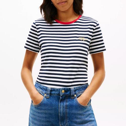 [해외배송] 타미 여성 스크립트 로고 스트라이프 티셔츠 White