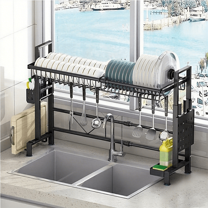 TEMU 메탈다용도 수납대 식기건조대 조절 가능한 블랙 메탈 주방 랙 확장식 접시 랙 식기 거치대 접시 슬롯 도마 보관함 주방 저장 랙 도구 홀더