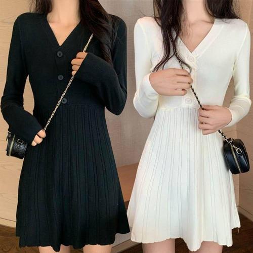 [HIP39] 긴팔 슬림 브이넥 단추 골지 미니원피스