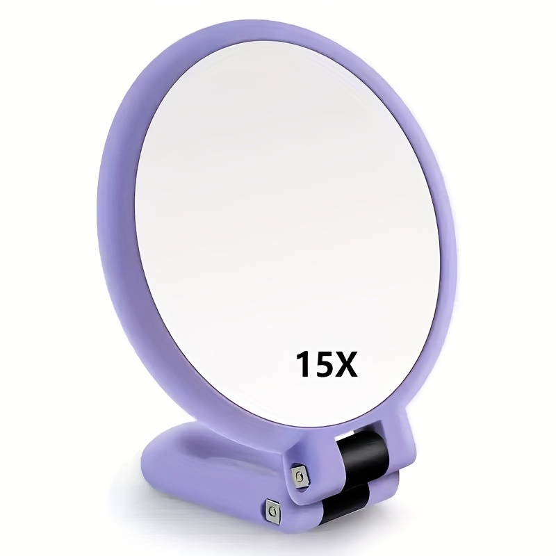 TEMU 조절 가능한 손잡이가 있는 휴대용 양면 접이식 거울, 1x/15x 배율, 휴대용 여행용 메이크업 거울, 광택 유리 마감