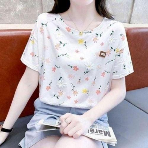 꽃 탑 반팔티셔츠 러블리 반소매티 라운드칼라화 WFLQD05