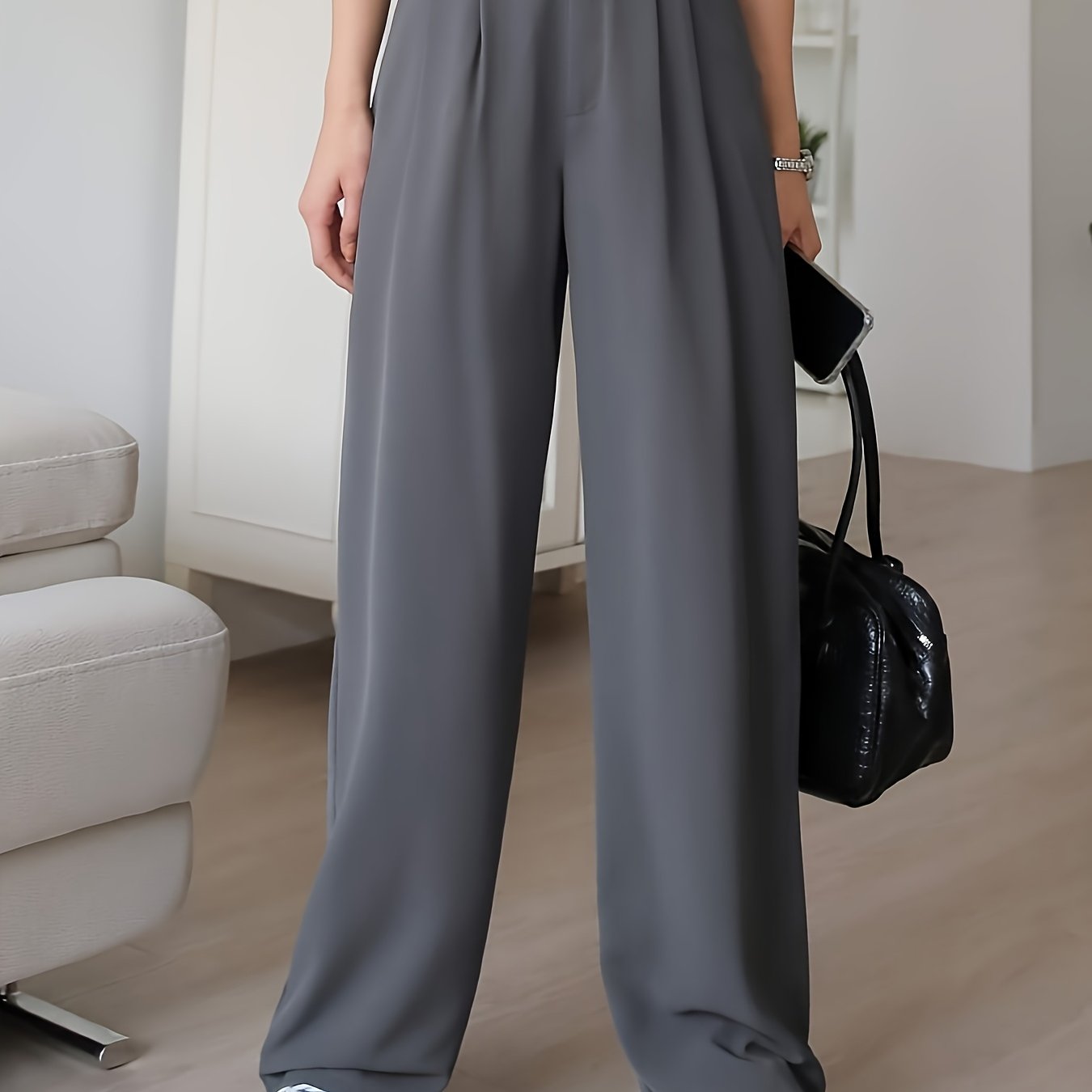 TEMU 접힌 러플 사선 포켓 팬츠, 솔리드 컬러 드레스 팬츠