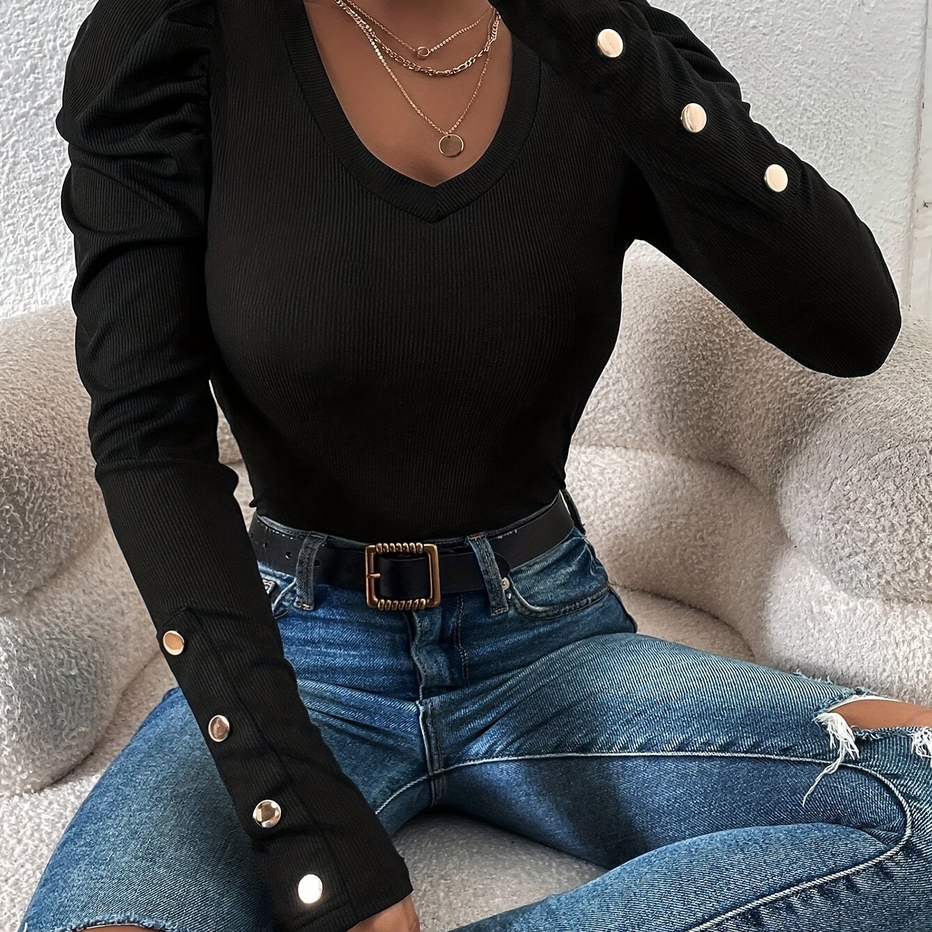 TEMU 가을&겨울 여성용 단색 V넥 캐주얼 다용도 긴팔 티셔츠 (버튼 디테일) | 우아한 스타일, 버튼 장식, 모든 계절에 적합