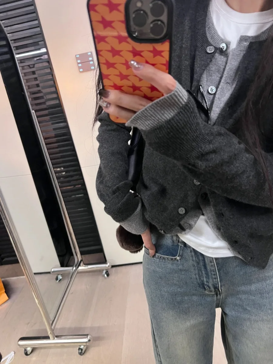 회색 니트 가디건 여성 슬림핏 라운드넥 페이크 투피스 봄 가을 고급스러운 느낌 다용도 긴팔 상의