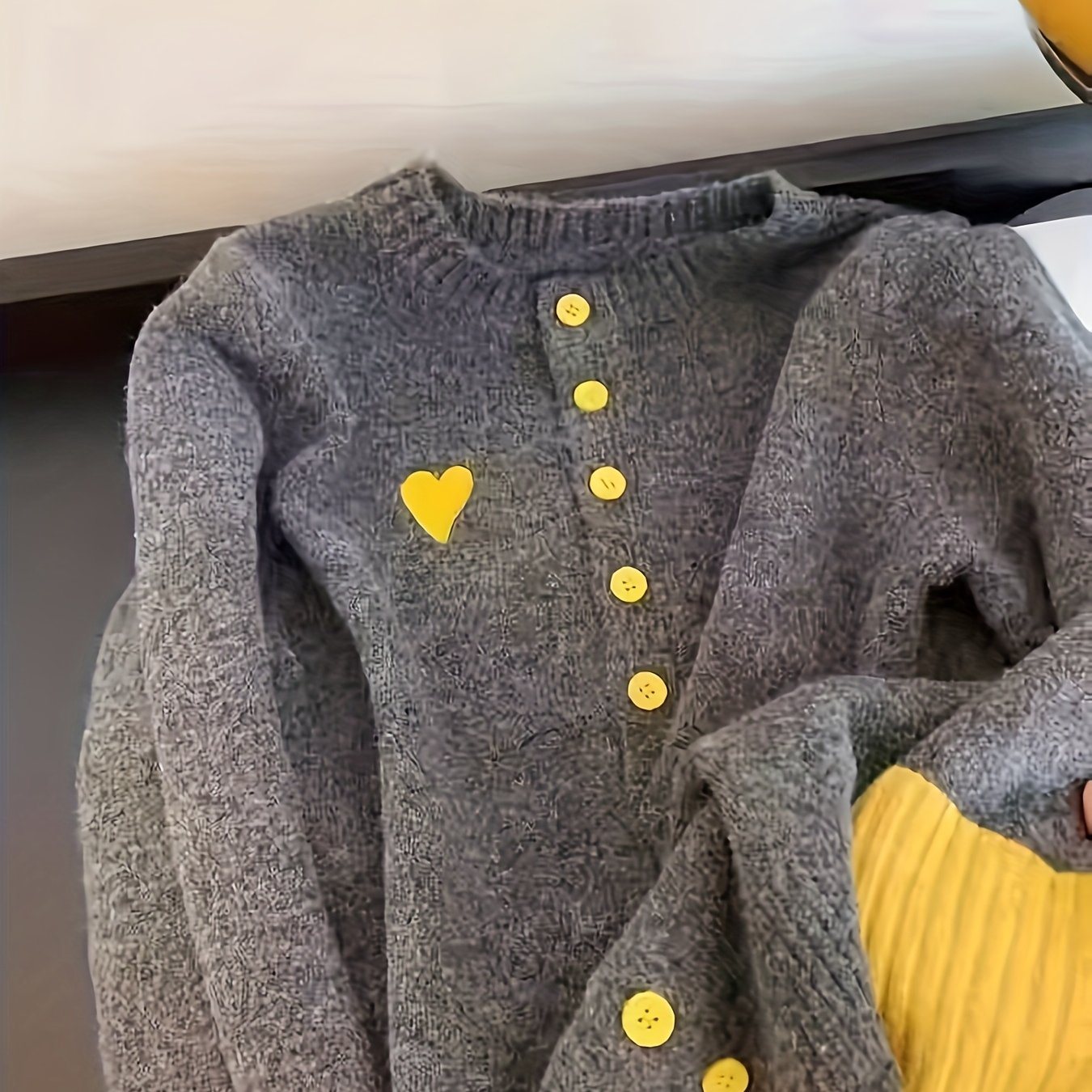 TEMU 여성용 우아한 컬러 블록 가디건 - 노란색 & 대비 효과의 부드러운 스웨터, 라운드넥, 긴소매, 버튼 앞면, 봄/가을 레이어링 아이템, 캐주얼 시크 스타일, 가디건 스웨터