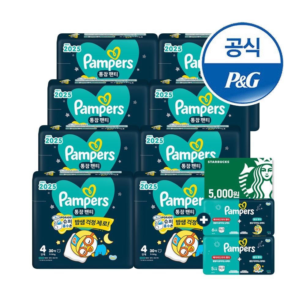 [기저귀사는날] 팸퍼스 2025 통잠팬티 기저귀 4~6단계 8팩+스타벅스5천원+체험팩16매