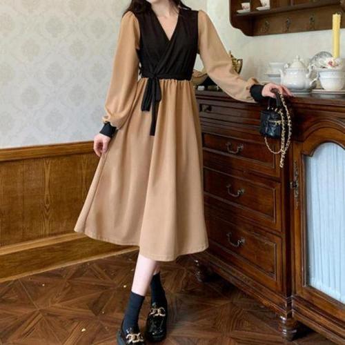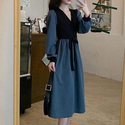 [셀러허브_여성트랜드패션]ONM 여성 하객룩 페미닌 투톤 배색 V넥 롱 원피스