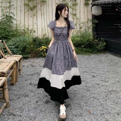 [셀럽하우스]체크패턴 STVJ1513 하단 배색 투톤포인트 A 라인 밴딩 롱원피스