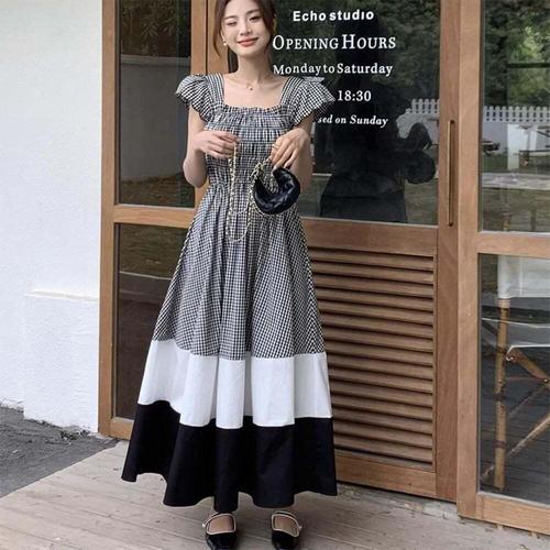 [셀럽하우스]패턴 DWSH9947 체크 추천 투톤 배색 스모크 밴딩 원피스