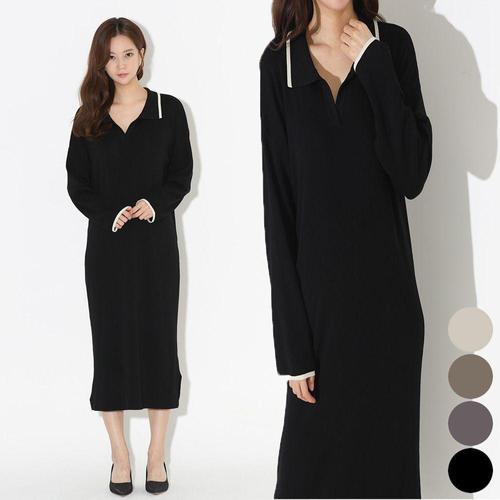 [셀럽하우스]블랙 APXK1222 루즈핏 롱원피스 투톤 배색 여성 니트 카라