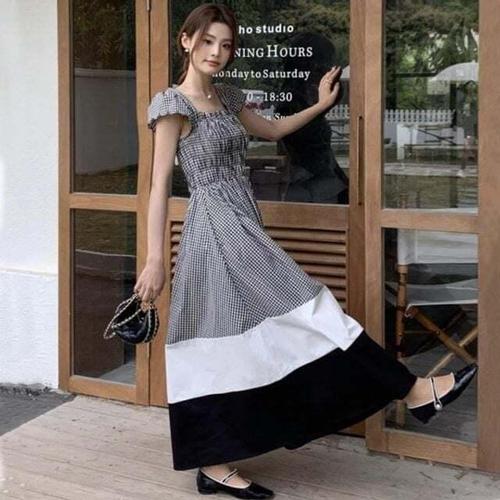 [셀럽하우스]패턴 VERY6254 베이직 체크 투톤 배색 올데이 스모크 밴딩 원피