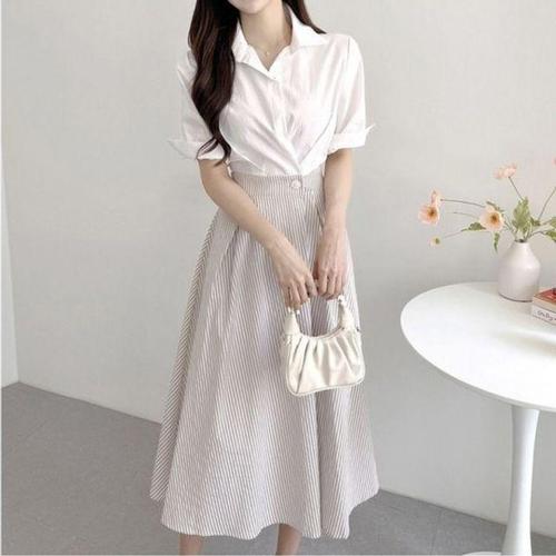 100kg까지 날씬해보이는 빅사이즈 우아한 셔츠 멜빵 치마 원피스 세트 봄 가을 슬림핏 단아한 하객룩 검정 무지 오피스룩 흰색 카라 남방 큰옷 4xl 캐주얼 a라인 롱원피스 투피스
