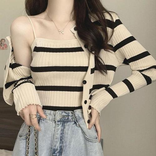 [XBI8KNNM]세트 여성가을가디건 나시 스트라이프 캐