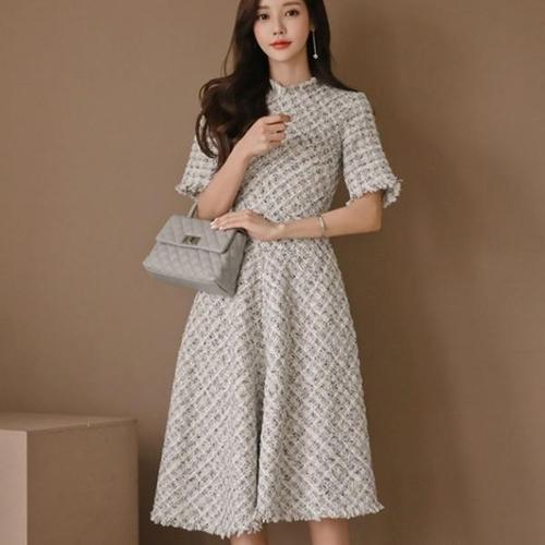 [엄지척]여자 베이직 모던 반팔 트위드 미디 A라인 원피스_19861541_667501