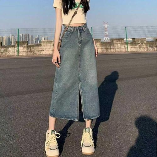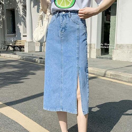 [셀럽하우스]데님 QEDU7297 베이직 여성 롱스커트 1P H라인 밑단 트임 허리