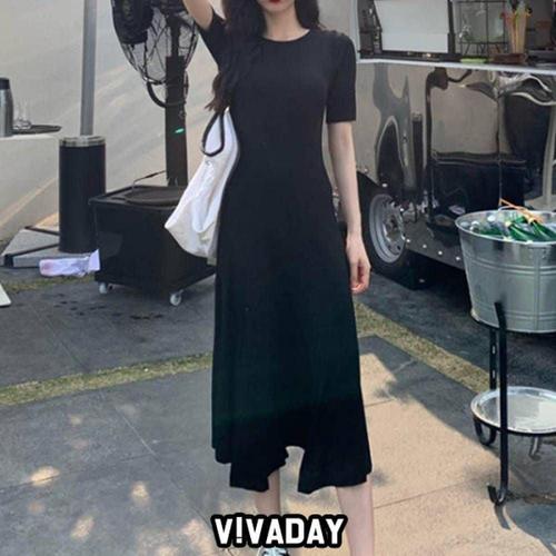 [룽스]레터링 플레어원피스 포인트 롱 옆트임 반팔 원피스