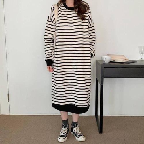 스트라이프 휴양지 트위드 여성 트임 롱니트 롱 WFKOINK
