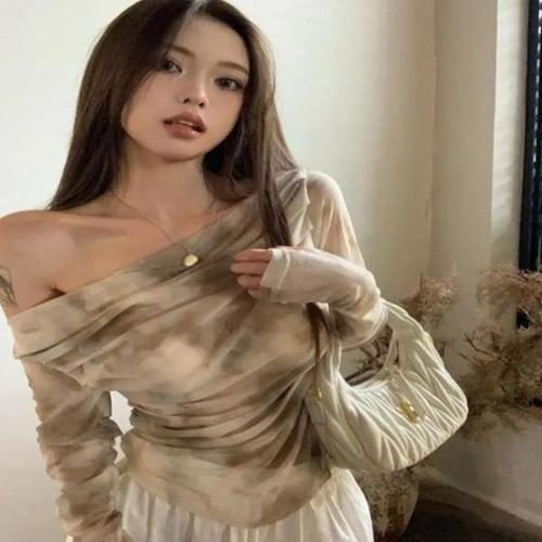 [엄지척]여성 망사 물감 오프숄더 셔링 긴팔 티셔츠 블라우스_19613508_667501