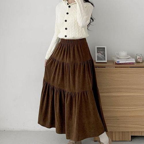 [다잇템]여성 롱 치마 코듀로이 귀여운 티어드 데일리룩_P407696977