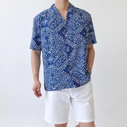 [오너클랜]인기상품 남자 파란색 패턴 반팔 셔츠 여름룩 해외 여행 패션 [WFFH70V_250918]