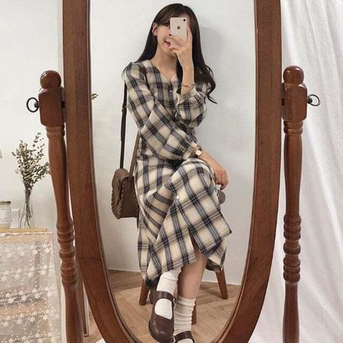 [셀럽하우스]체크 BIRJ8097 패턴 브이넥 셔츠형 단추 롱원피스 가을 데일리
