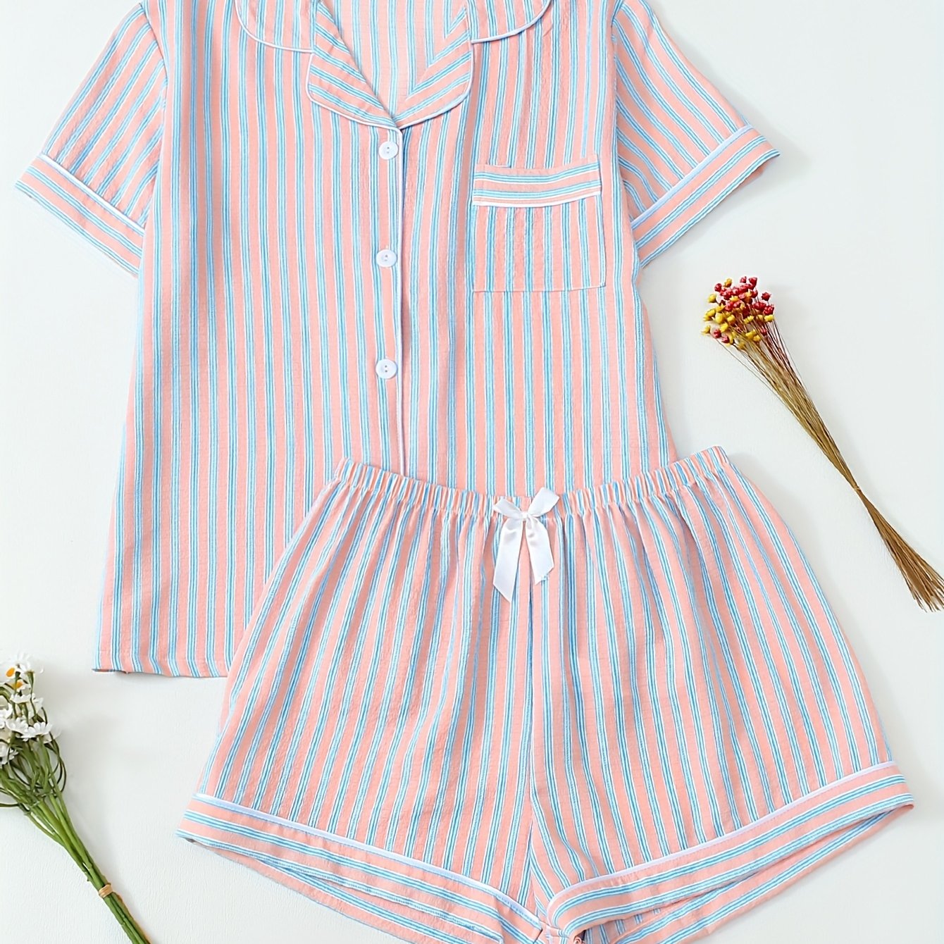 TEMU 여성용 반팔 반바지 파자마 세트, 편안한 소재에 버튼 탑과 핏된 반바지가 있습니다.