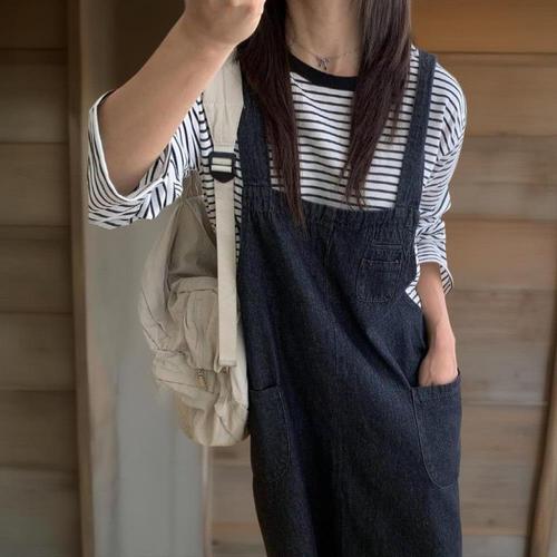 [미라클세븐]여성 키치 무드 루즈핏 사각 패치 멜빵 데님 롱 드레스