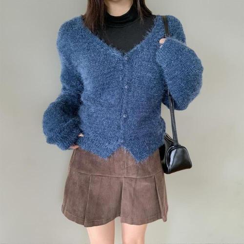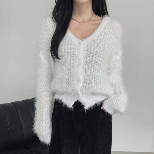 [옷자락] 여성 브이넥 앙고라 퍼 스타일 부클 니트 카디건
