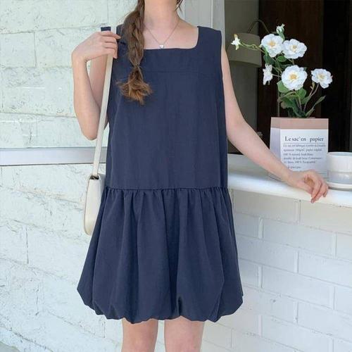 옷자락 / 여자 플레어 스퀘어넥 퍼프 생지 데님 미니 원피스