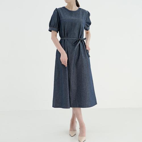 [위시드]절개 소매 퍼프 핀턱 데님 롱 원피스 (WIAAOP074)