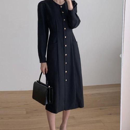 [셀러허브_여성트랜드패션]세련된 데일리룩 하이넥 롱원피스 블랙 퍼프소매 우아한