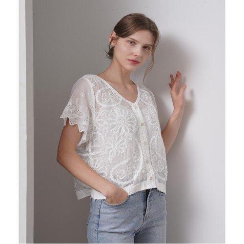 [옷자락]여성 아이보리 리본 펀칭 플라워 자수 반팔 셔츠