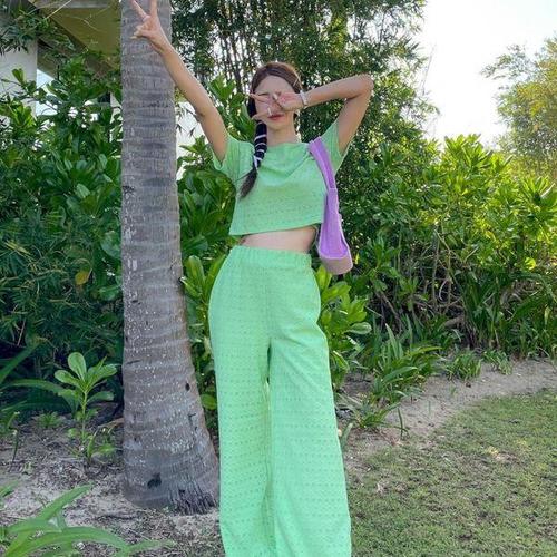 [옷자락]여자 여름 투피스 펀칭 크롭티 와이드 밴딩 팬츠 세트