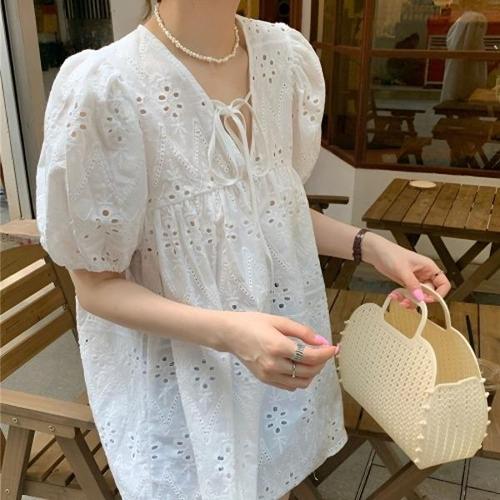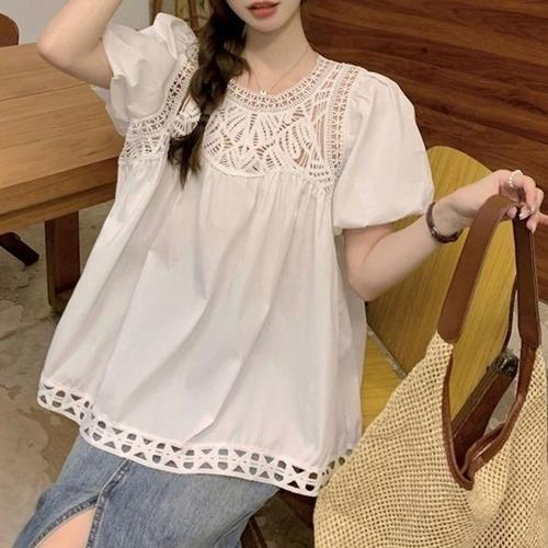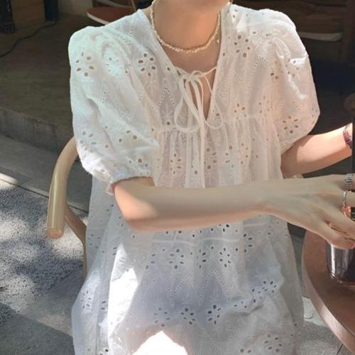 [엄지척]퍼프소매 여성 펀칭 레이스 A라인 반팔 블라우스_19651832_667501
