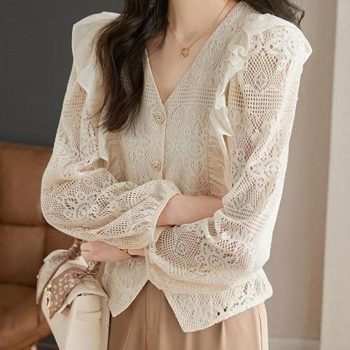 [엄지척]여성 펀칭 프릴소매 레이스 얇은 긴팔 블라우스 청순_19643909_667501