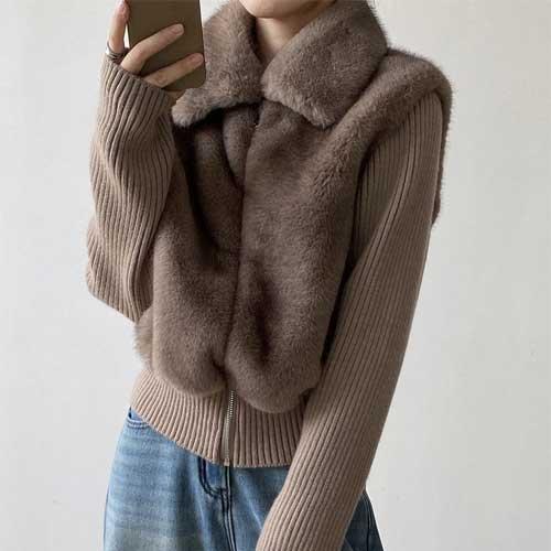 [릴룸]비건퍼 카라 니트 집업 페이크퍼 자켓