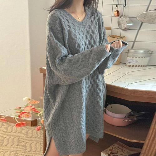 [문에이블]문에이블 겨울 데일리룩 편안한 루즈핏 브이넥 볼륨 꽈배기 니트 미니 원피스
