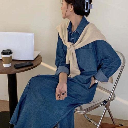 [셀럽하우스]스타일리쉬한 GFED4976 미디 데님 포켓 캐주얼 긴팔 셔츠원피스