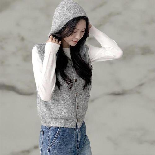 [옷자락]여성 후드 니트 조끼 포켓 버튼 기본핏 돌돌이