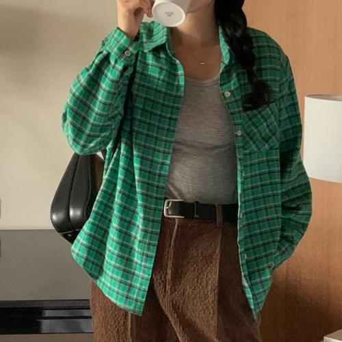 [옷자락]여성 체크무늬 넥카라 단추 포켓 데일리 셔츠