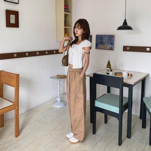 [옷자락]여자 캐주얼 허리스트링 밴딩 포켓 카고 와이드 팬츠