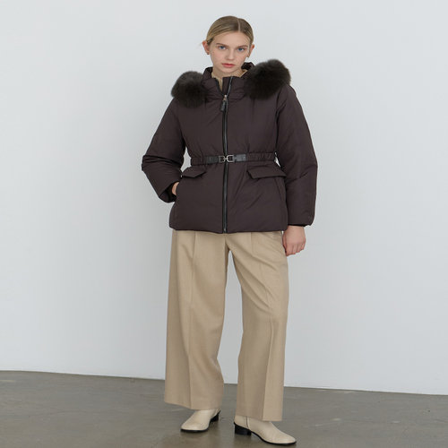 닥스 여성 [클리어런스][폭스FUR][구스다운] 브라운 탈착 후드 벨티드 숏 중량다운 점퍼 (DLJU4D013W3)