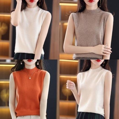 여성용 데일리 민소매 터틀넥 나시 슬림 스판 폴라 니트 티셔츠
