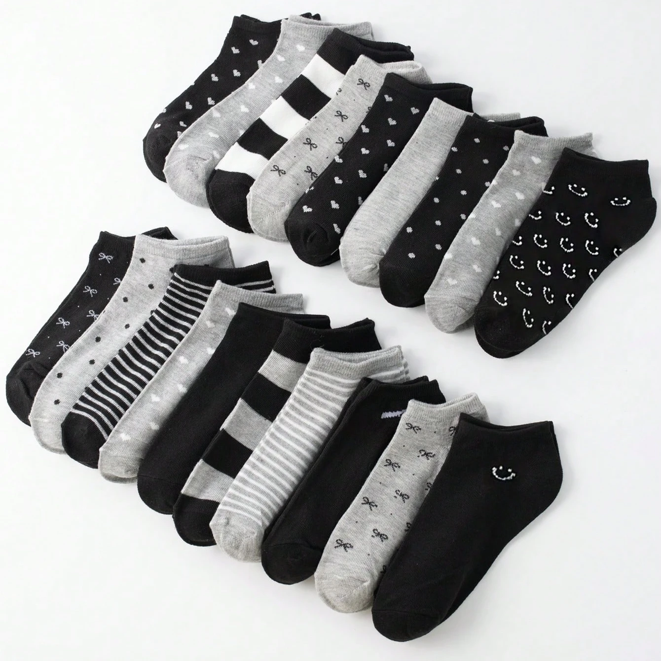 20 쌍 여성/남성 가족 매칭 짧은 양말, 리본, 하트, 스트라이프가 있는 검정색 및 회색 시리즈