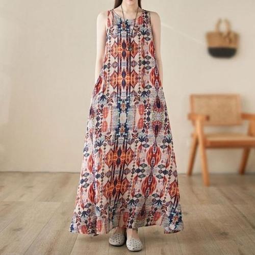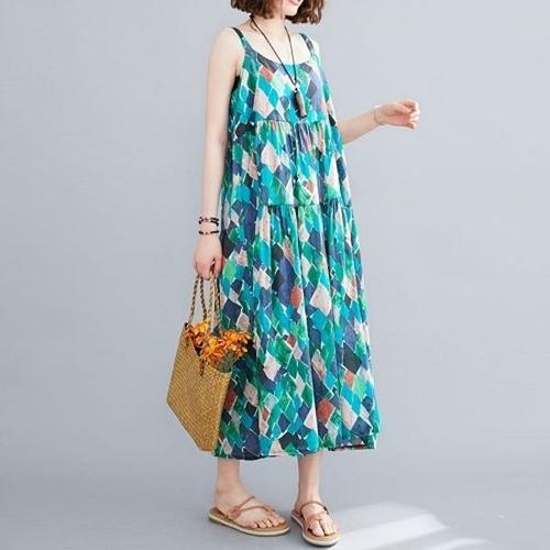 [엄지척]여성 여름 루즈핏 프린트 민소매 홑겹 롱 면 원피스_19910080_667501