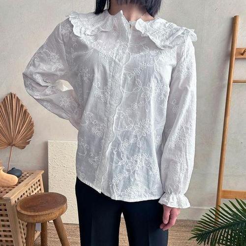 꽃무늬블라우스 이중 프릴 카라 레이스 자수 블라우스 나들이룩