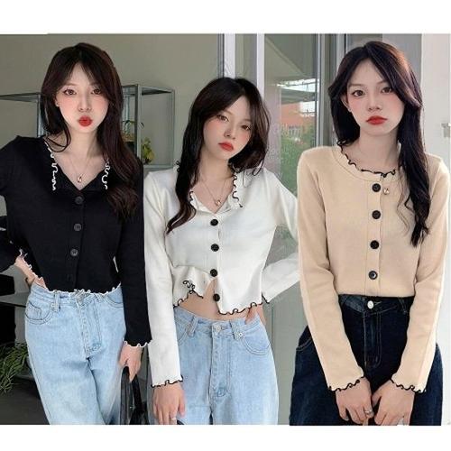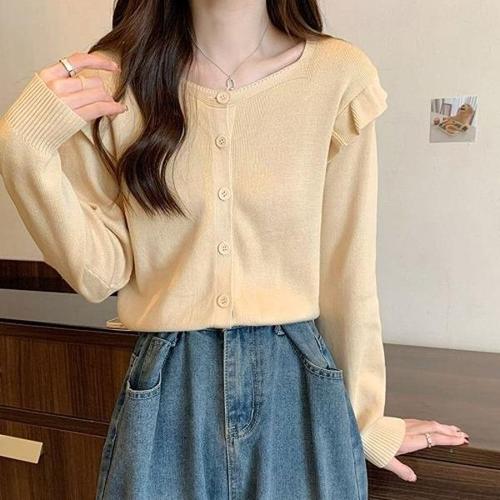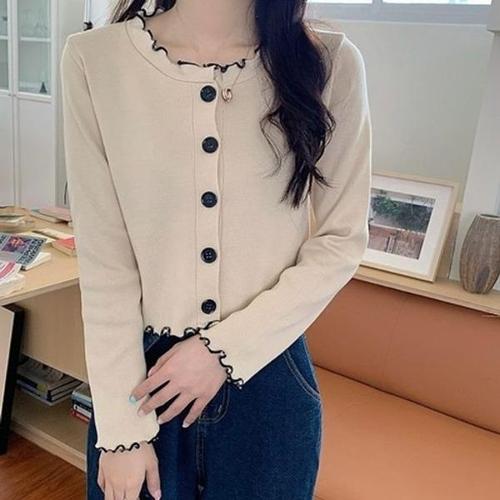 TKX 여성용 봄 가을 라운드넥 우아한 프릴 장식 니트 가디건 간편 여성스러운 KN53