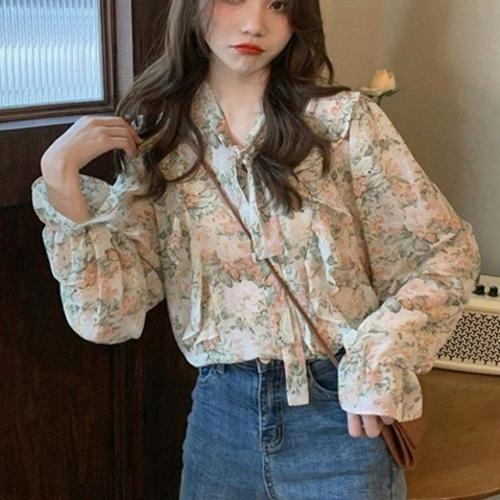해피유통 여성 봄여름 플라워 패턴 긴팔 블라우스 퍼프 소매 디자인 패셔너블하고 사랑스러운byq
